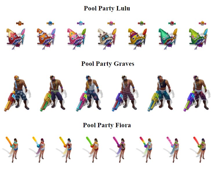 Pool party graves chromas. There should be a law against those abs. Pool Party Fiora Chromas - 290 RP Each 3550 RP for the Bundle less if you already own the champion and skin New textures - I am an artist with a pool noodle SMACK. I thought they were going to be released on 714 or is it just sometime throughout patch 714.